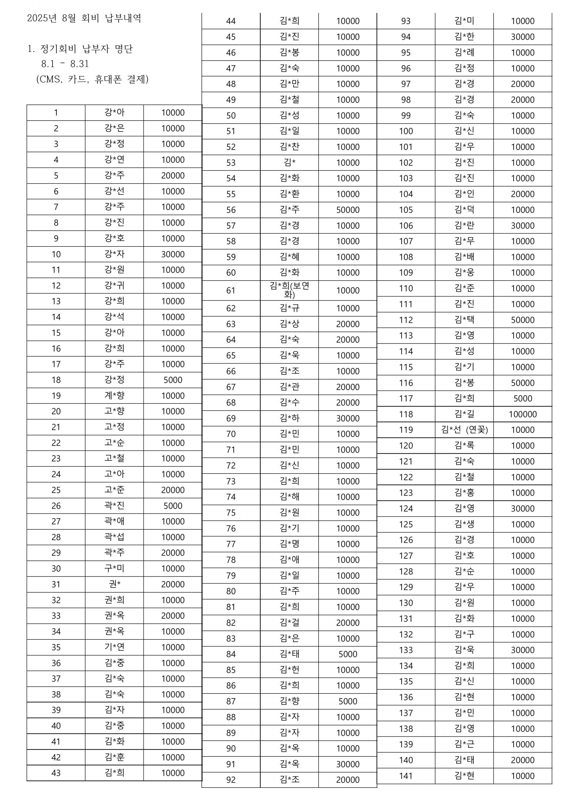 사단법인 평화의길 2025년 8월 회비납부명단